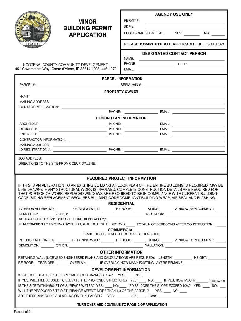 MINOR. BUILDING PERMIT. APPLICATION. Page 1 of 2. KOOTENAI COUNTY COMMUNITY DEVELOPMENT 451 Government Way, Four d Alone, ID 83814 (208) 446-1070
