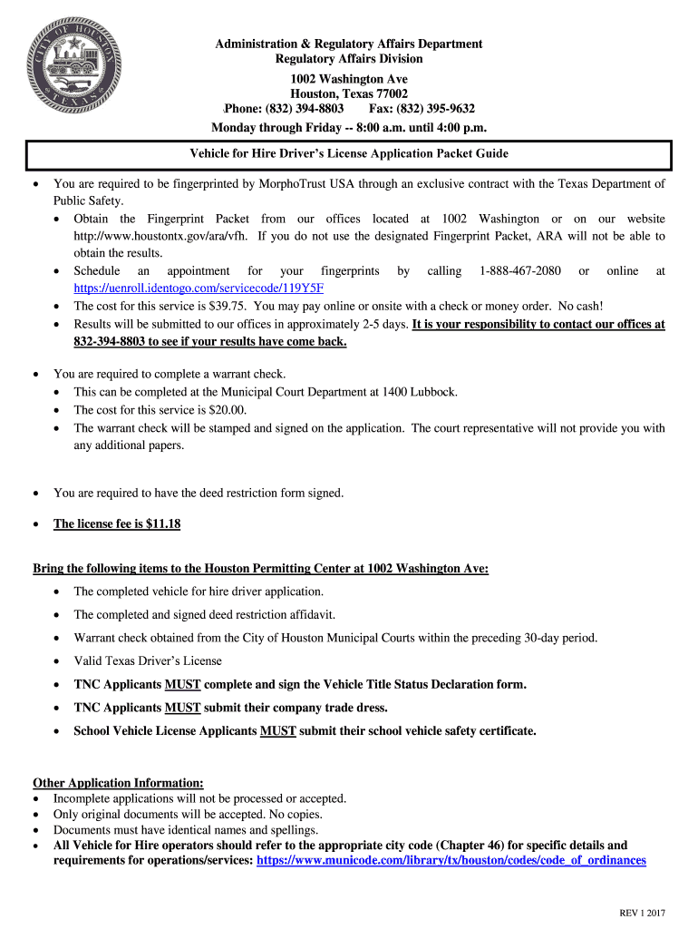 Get the free Vehicle for Hire Driver s License Application Packet Guide - houstontx