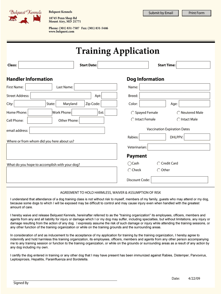 Training Application. Bequest Kennels 18745 Penn Shop Rd. Mount Airy, MD 21771. Phone: (301) 831-7507 Fax: (301) 831-5446. www.belquest.com. Class: Start Date: Start ...