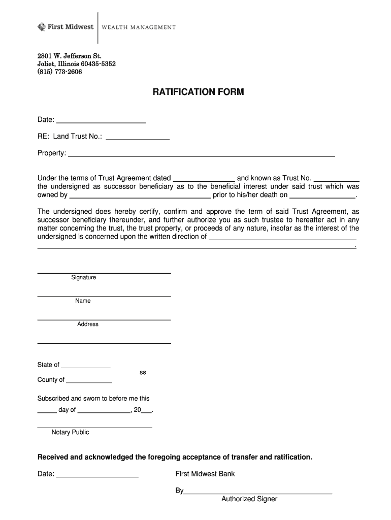 2801 W. Jefferson St. Joliet, Illinois 60435-5352 (815) 773-2606. RATIFICATION FORM. Date: RE: Land Trust No.: Property: Under the terms of Trust Agreement dated
