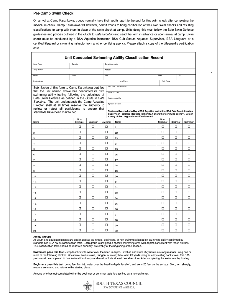 The Pre-Camp Swim Check Form is an Activity Participation Form used by Boy Scouts of America (BSA) units to certify the swimming ability of their members before attending Camp Karankawa.
