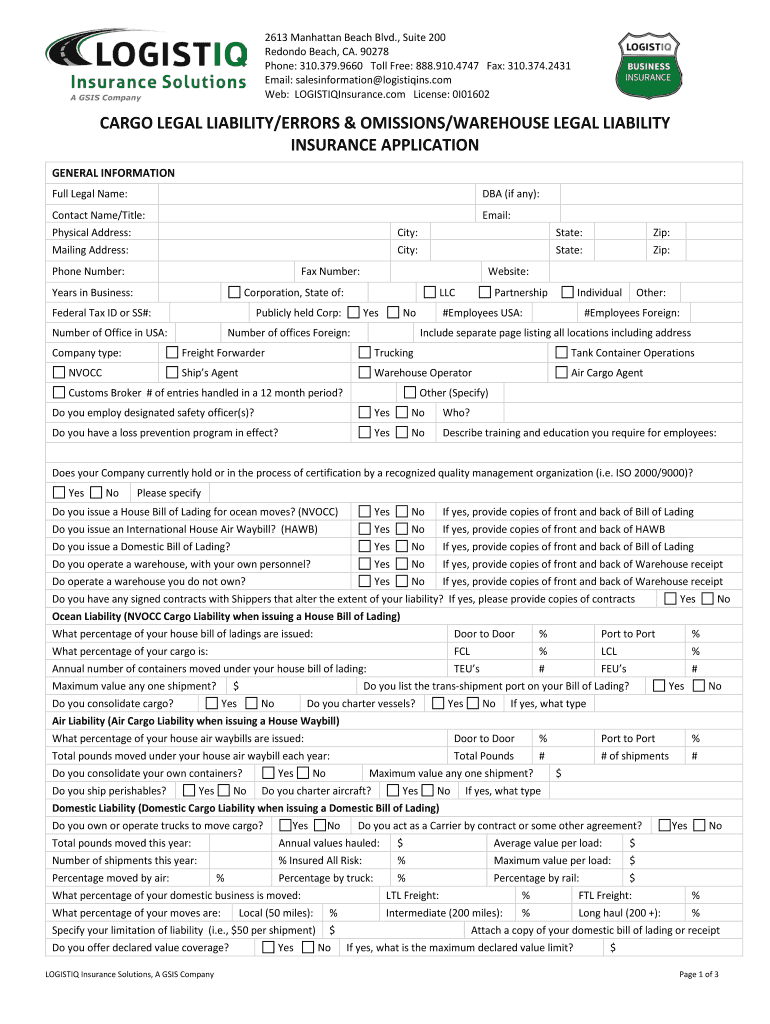 LOGISTIC Insurance Solutions, A ISIS Company Page 2 of 3. Prior Coverage Have you ever had any lapses in your Cargo Legal Liability coverage?
