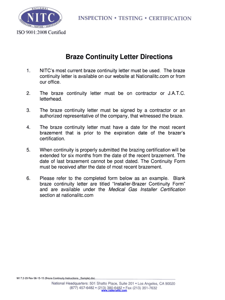 Braze Continuity Letter Directions 1. ITC s most current braze continuity letter must be used. To braze continuity letter is available on our website at Nationalitc.com or from our office. 2. To braze