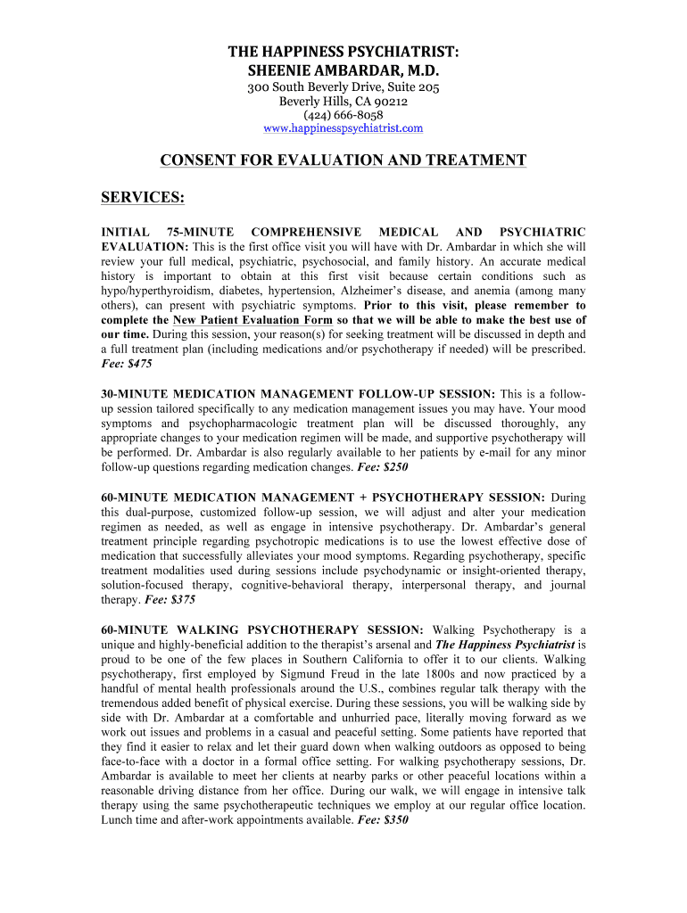 THE HAPPINESS PSYCHIATRIST: SHEENIER AMANDA, M.D. 300 South Beverly Drive, Suite 205 Beverly Hills, CA 90212 (424) 6668058 www.happinesspsychiatrist.com CONSENT FOR EVALUATION AND TREATMENT SERVICES: