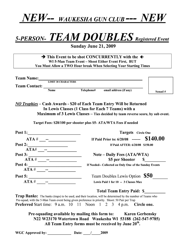 NEW5PERSON WAUKESHA GUN CLUB NEW TEAM DOUBLES Registered Event Sunday, June 21, 2009, This Event to be shot CONCURRENTLY with the WI 5Man Team Event Shoot Either Event First, BUT You Must Allow a