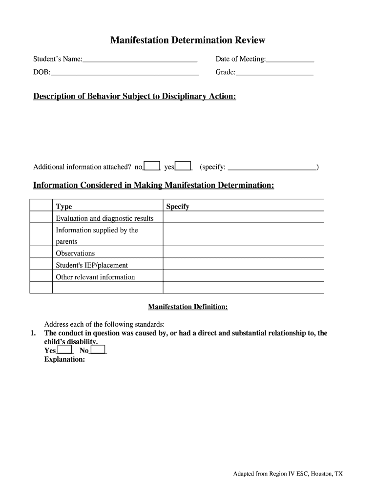 The Manifestation Determination Review Form is a key document used in the evaluation of a student’s behavior concerning disciplinary actions in the context of special education. This form helps determine whether the behavior leading to disciplinary action is related to the student's disability. Understanding the role of this form is vital for ensuring that students receive fair treatment and appropriate support during disciplinary procedures.