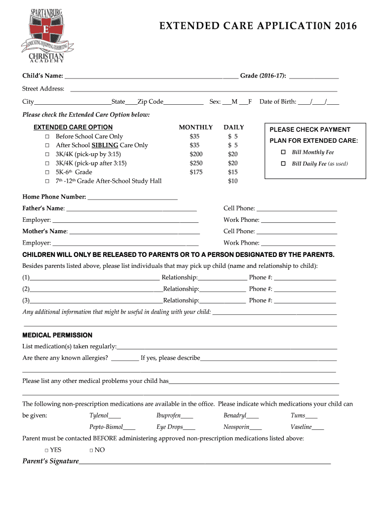 Get the free The Extended Care program (after school daycare) is only available for SCA students ...