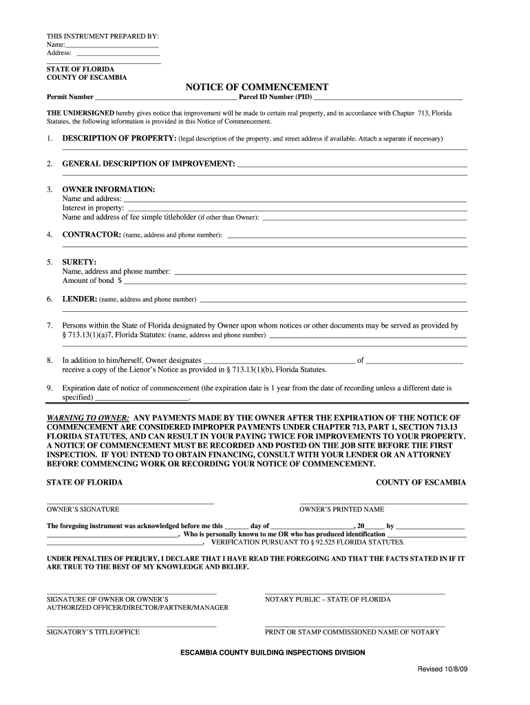 Get the free Notice To Owner Form Package - Escambia County