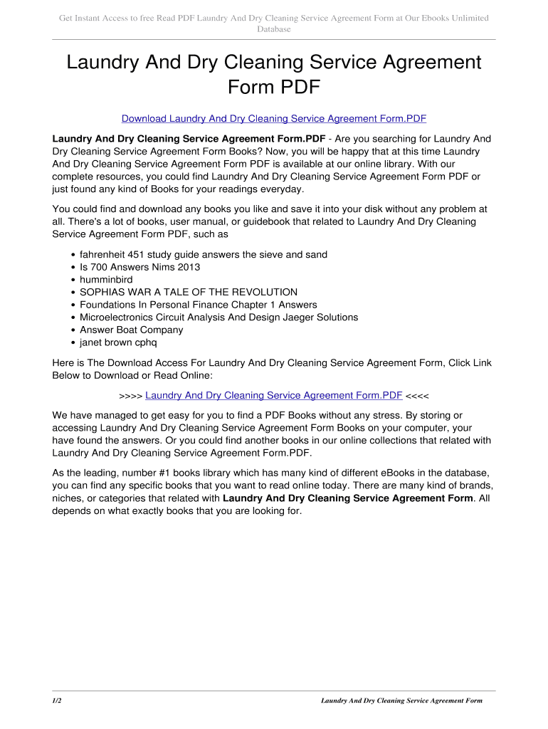 Get Instant Access to free Read PDF Laundry And Dry Cleaning Service Agreement Form at Our E-Books Unlimited Database Laundry And Dry Cleaning Service Agreement Form PDF Download Laundry And Dry Cleaning
