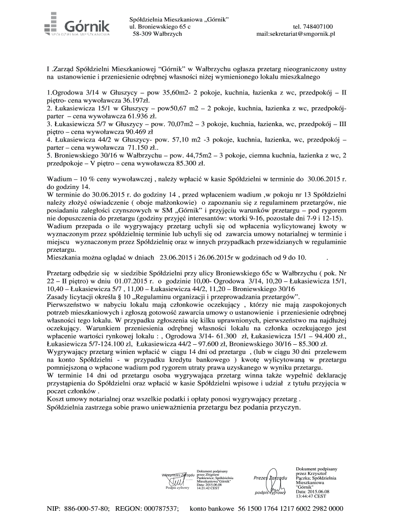 Sp Delia Mieszkaniowa G rink UL. Broniewskiego 65 c 58-309 Wei branch tel. 748407100 mail:Secretariat smgornik.pl I. Zara d Sp Delhi Mieszkaniowej G rink w Wei branch OG Asia prepare nieograniczony