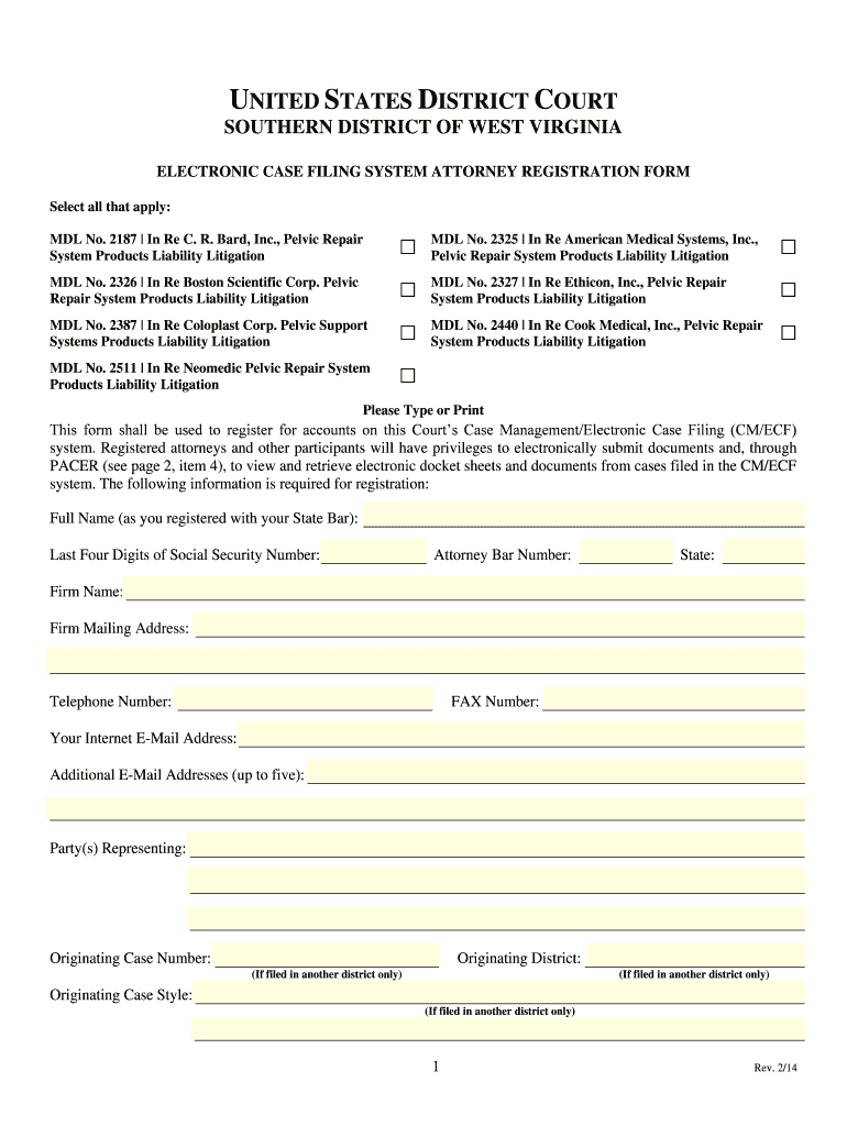 The form is designed for attorneys who are practicing in West Virginia and require registration for the CM/ECF system to electronically file documents with the court.