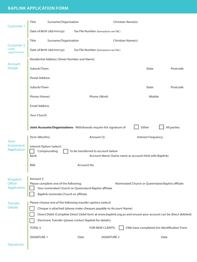 Account Application Form TERMS AND CONDITIONS 1. All investments will be administered by Bap link which operates as part of The Baptist Union of Queensland of 37 ...