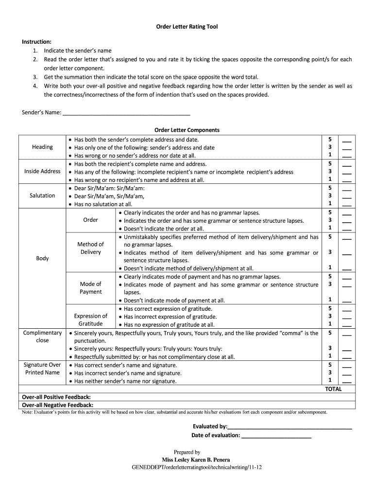 2. Read the order letter that's assigned to you and rate it by ticking the spaces opposite the corresponding point/s for each