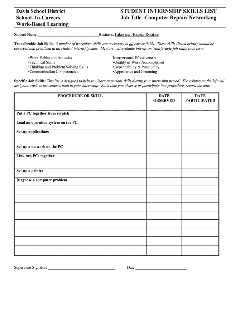 Davis School District SchoolToCareers Workbasket Learning STUDENT INTERNSHIP SKILLS LIST Job Title: Computer Repair/ Networking Student Name: Business: Lake view Hospital Rotation Transferable Job