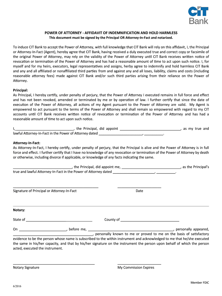 Member FDIC 6/2016 POWER OF ATTORNEY — AFFIDAVIT OF INDEMNIFICATION AND HOLD HARMLESS This document must be signed by the Principal OR A orney-In-Fact and notarized.