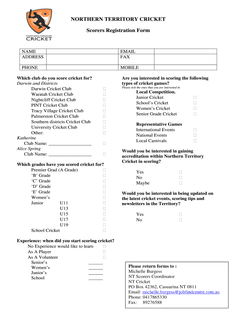 NORTHERN TERRITORY CRICKET Scorers Registration Form NAME ADDRESS EMAIL FAX PHONE MOBILE Which club do you score cricket for? Darwin and Districts Darwin Cricket Club Warmth Cricket Club Night cliff