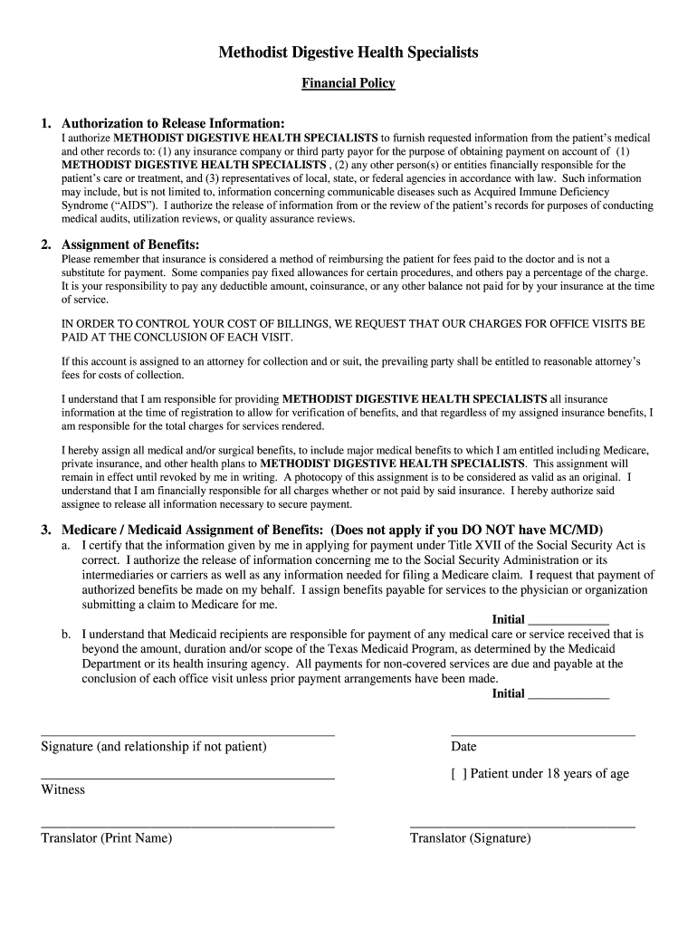 I authorize METHODIST DIGESTIVE HEALTH SPECIALISTS to furnish requested information from the patients