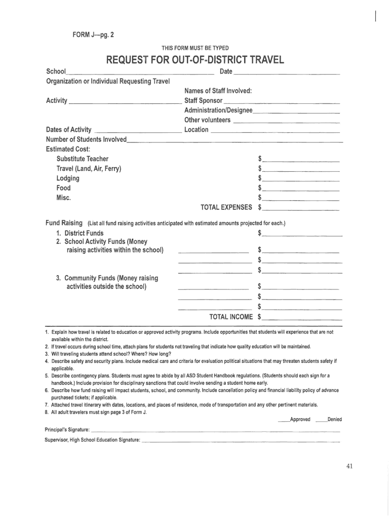 FORM J-pg.1 REQ EST FOR OUT-OF-OISTRICT TRAVEL STUDENT TRAVEL Any out-of-district travel by students under the auspices of the School District, except travel to contiguous Boroughs or ASIA State Tournaments