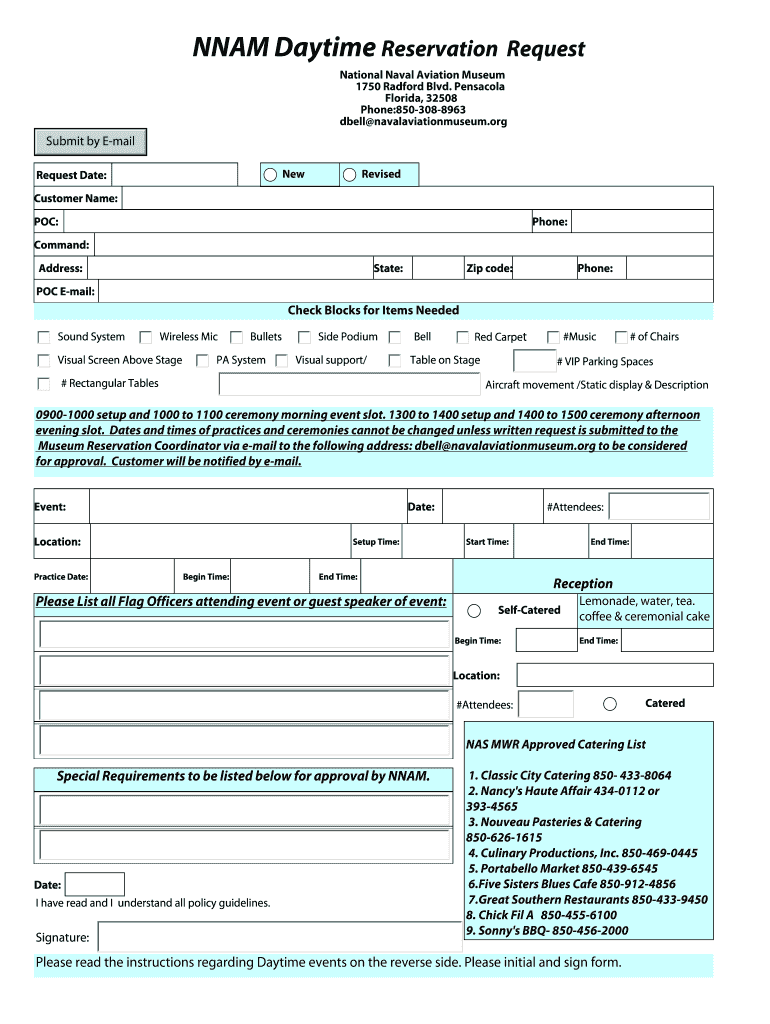 NAM Daytime Reservation Request. 1750 Bradford Blvd. Pensacola National Naval Aviation Museum. Florida, 32508 Phone:850-308-8963. Dbell@navalaviationmuseum.org.