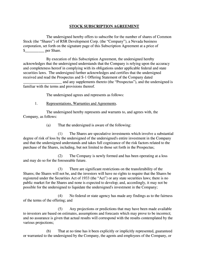 STOCK SUBSCRIPTION AGREEMENT The undersigned hereby offers to subscribe for the number of shares of Common Stock (the Shares) of RSR Development Corp. (the Company), a Nevada business corporation,