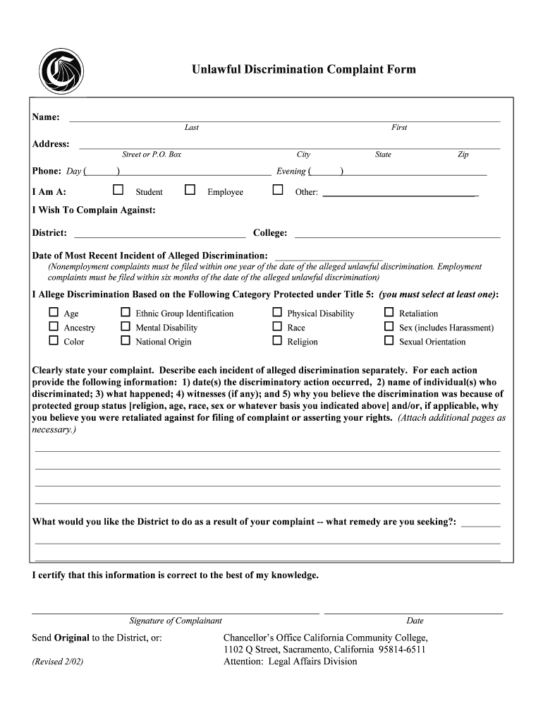 Unlawful Discrimination Complaint Form Name: Last First Address: Street or P.O. Box Phone: Day (I Am A: City) Evening (Student Employee State Zip) Other: I Wish To Complain Against: District: College: