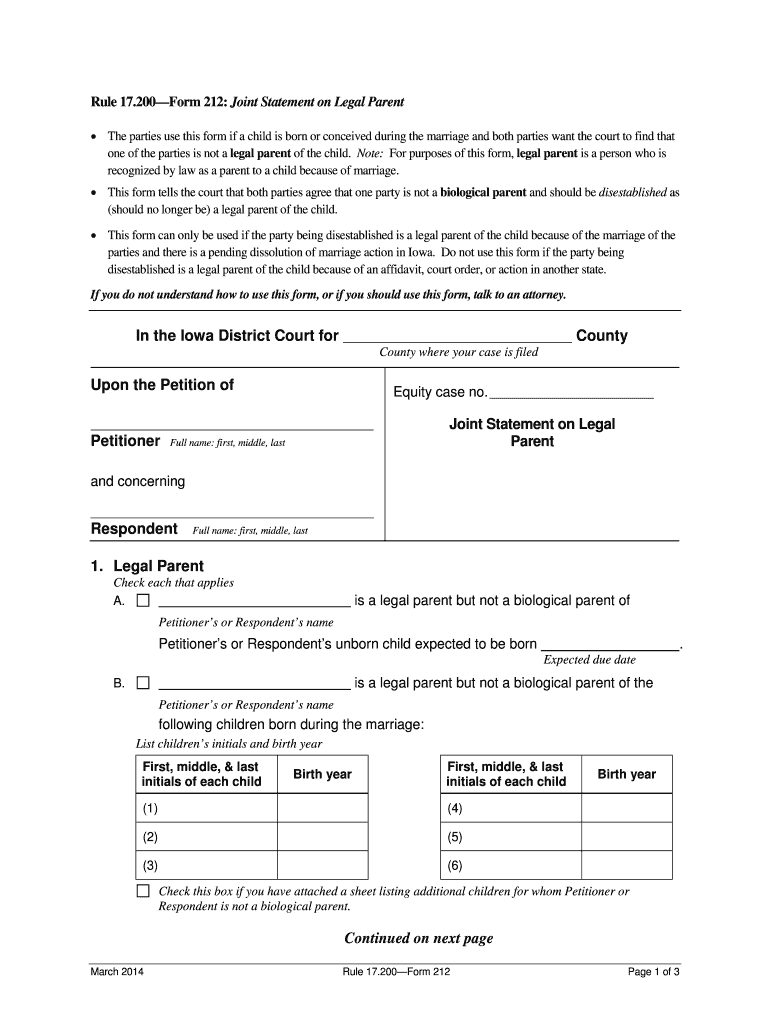 Get the free Joint Statement on Legal Parent. Rule 17.200 Form 212 - iowacourts