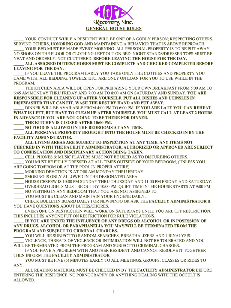 GENERAL HOUSE RULES YOUR CONDUCT WHILE A RESIDENT WILL BE ONE OF A GODLY PERSON; RESPECTING OTHERS, SERVING OTHERS, HONORING GOD AND MAINTAINING A BEHAVIOR THAT IS ABOVE REPROACH. YOUR BED MUST BE