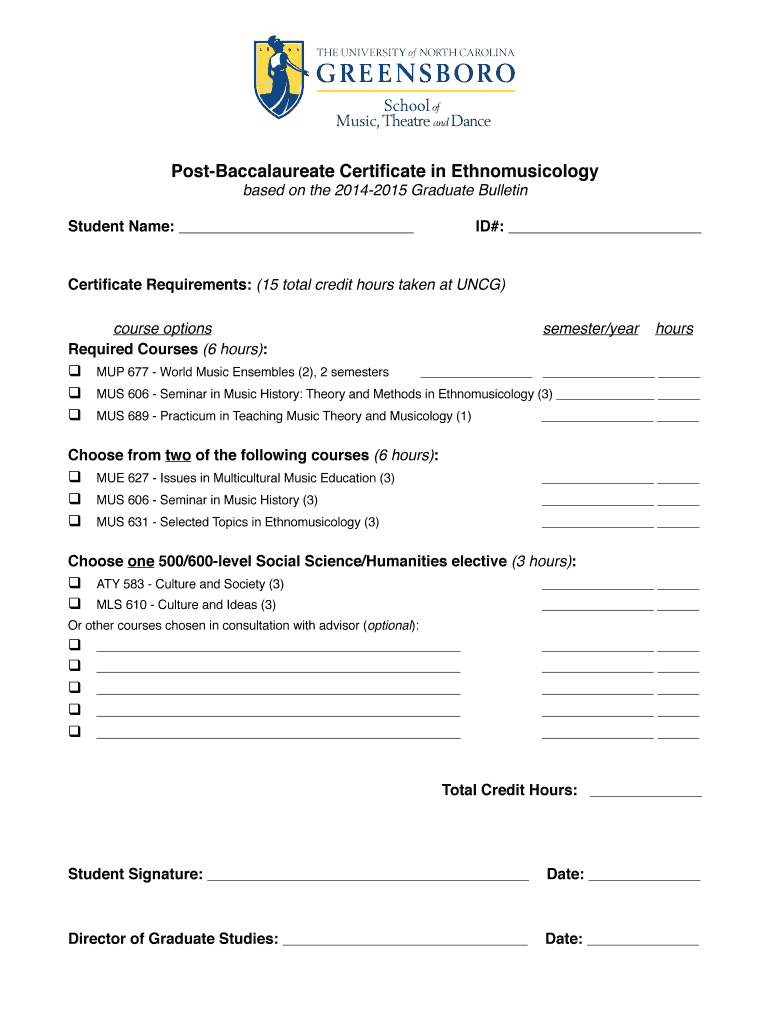 Post-Baccalaureate Cert?came in Ethnomusicology based on the 2014-2015 Graduate Bulletin Student Name: ! !ID#: ...