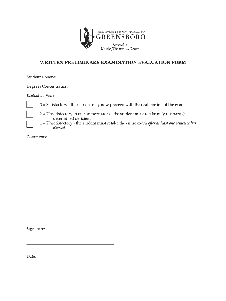 Get the free WRITTEN PRELIMINARY EXAMINATION EVALUATION FORM - vpa.uncg.edu - vpa uncg