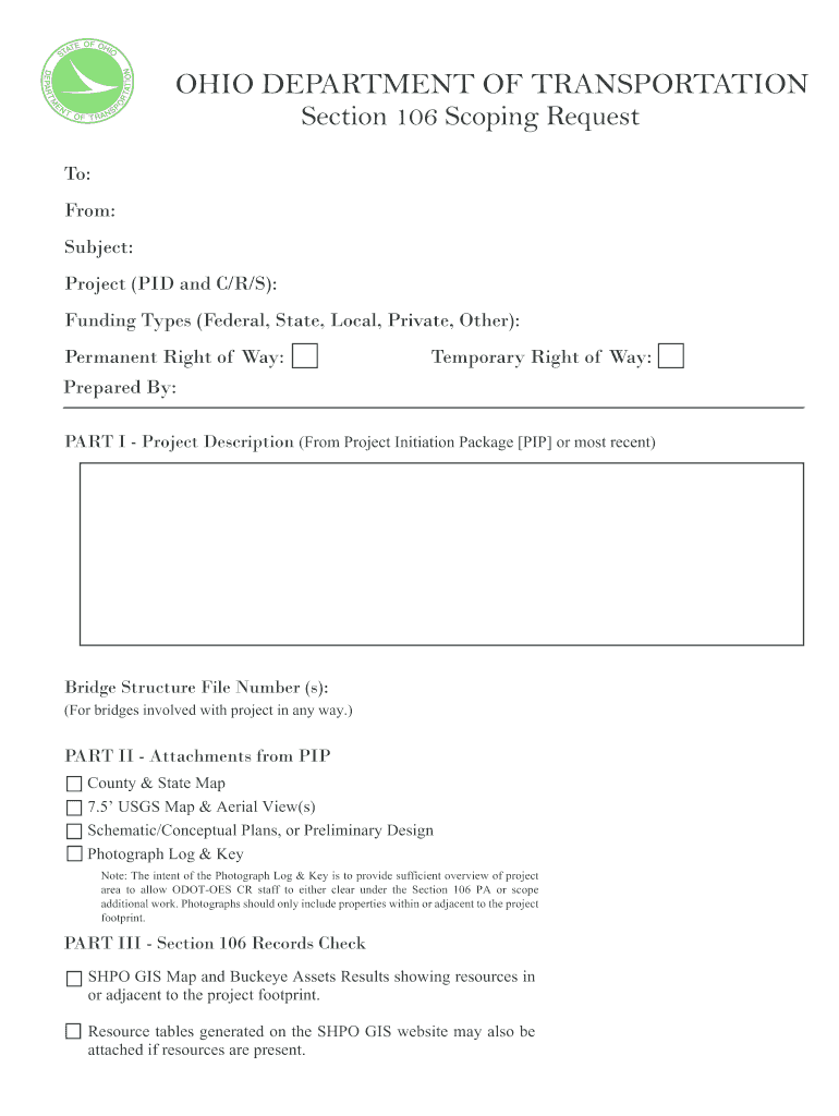 Section 106 Scoping Request To: From: Subject: Project (PID and C/R/S): Funding Types (Federal, State, Local, Private, Other): Permanent Right of Way: Temporary Right ...