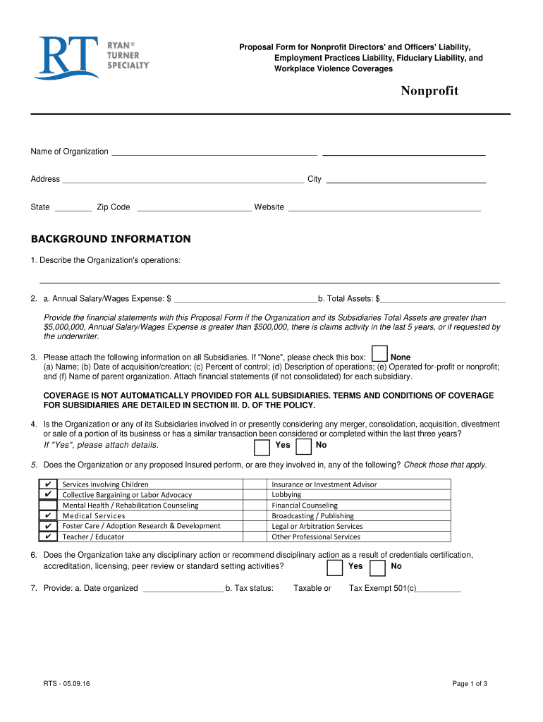 Proposal Form for Nonprofit Directors and Officers Liability, Employment Practices Liability, Fiduciary Liability, and Workplace Violence Coverages