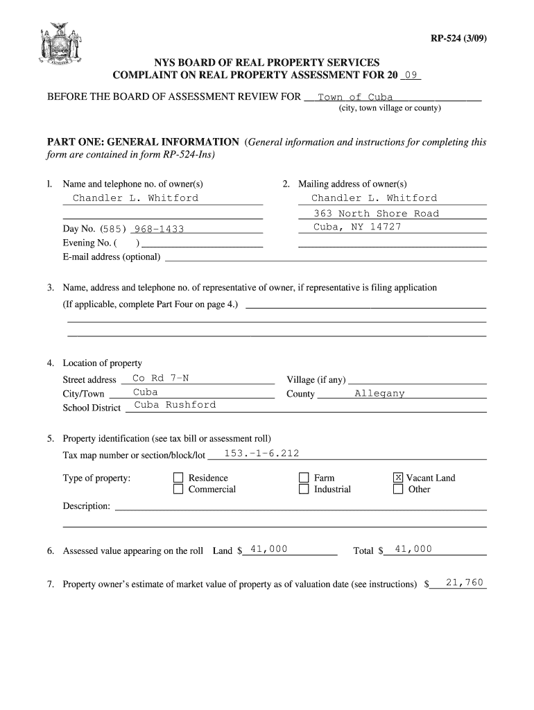 RP524 (3/09) NYS BOARD OF REAL PROPERTY SERVICES 09 COMPLAINT ON REAL PROPERTY ASSESSMENT FOR 20 BEFORE THE BOARD OF ASSESSMENT REVIEW FOR Town of Cuba (city, town village or county) PART ONE: GENERAL