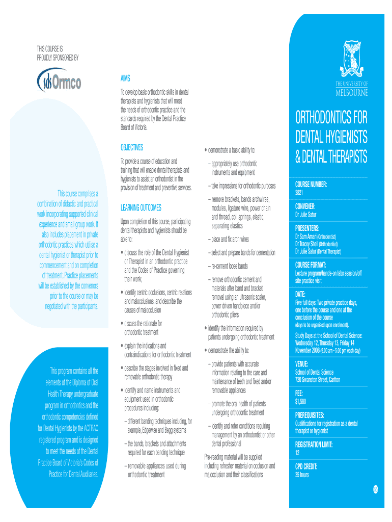THIS COURSE IS PROUDLY SPONSORED BY AIMS To develop basic orthodontic skills in dental therapists and hygienists that will meet the needs of orthodontic practice and the standards required by the