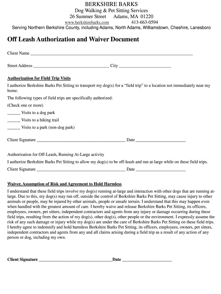 Get the free Off Leash Authorization and Waiver Document