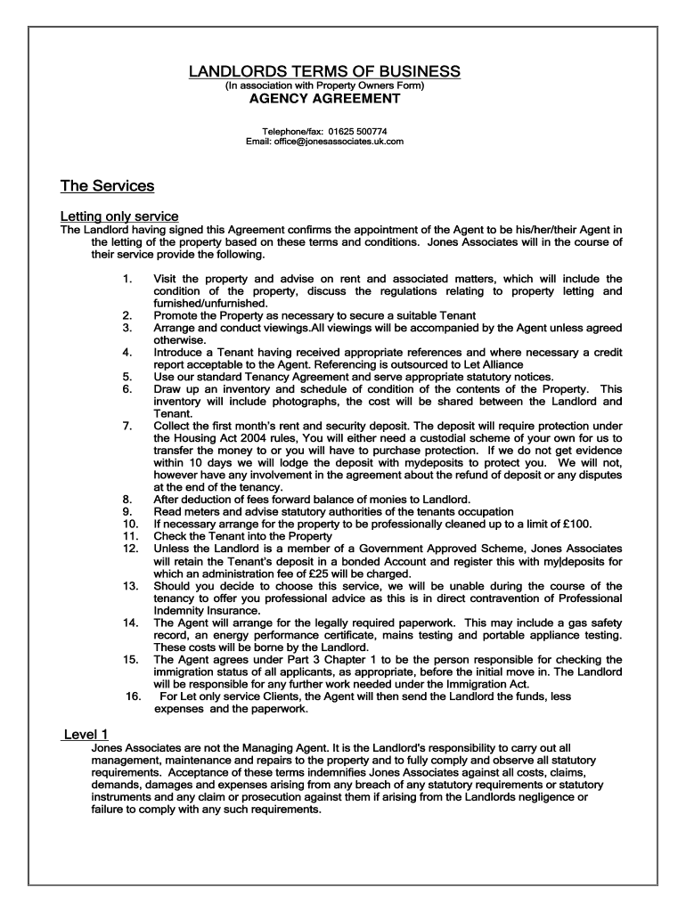 LANDLORDS TERMS OF BUSINESS (In association with Property Owners Form) AGENCY AGREEMENT Telephone/fax: 01625 500774 Email: office jonesassociates.uk.com The Services Letting only service The Landlord