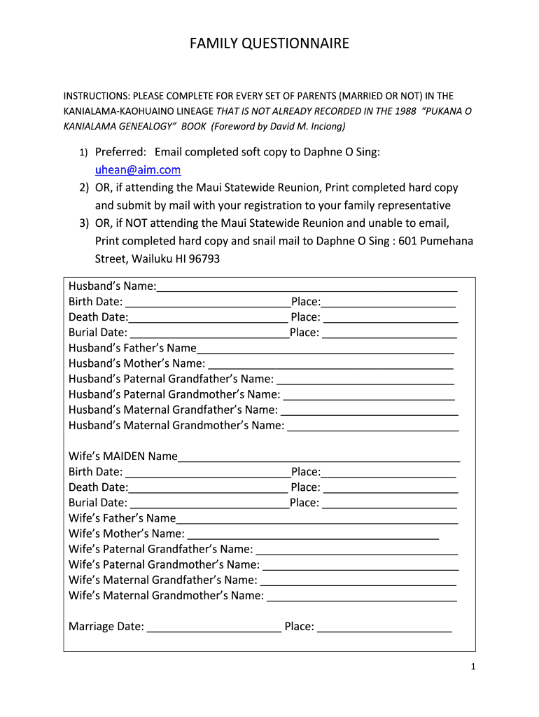 Family questionnaire 1 instructions: please complete for every set of parents (married or not) in the kanialama-kaohuaino lineage that is not already recorded in the ...