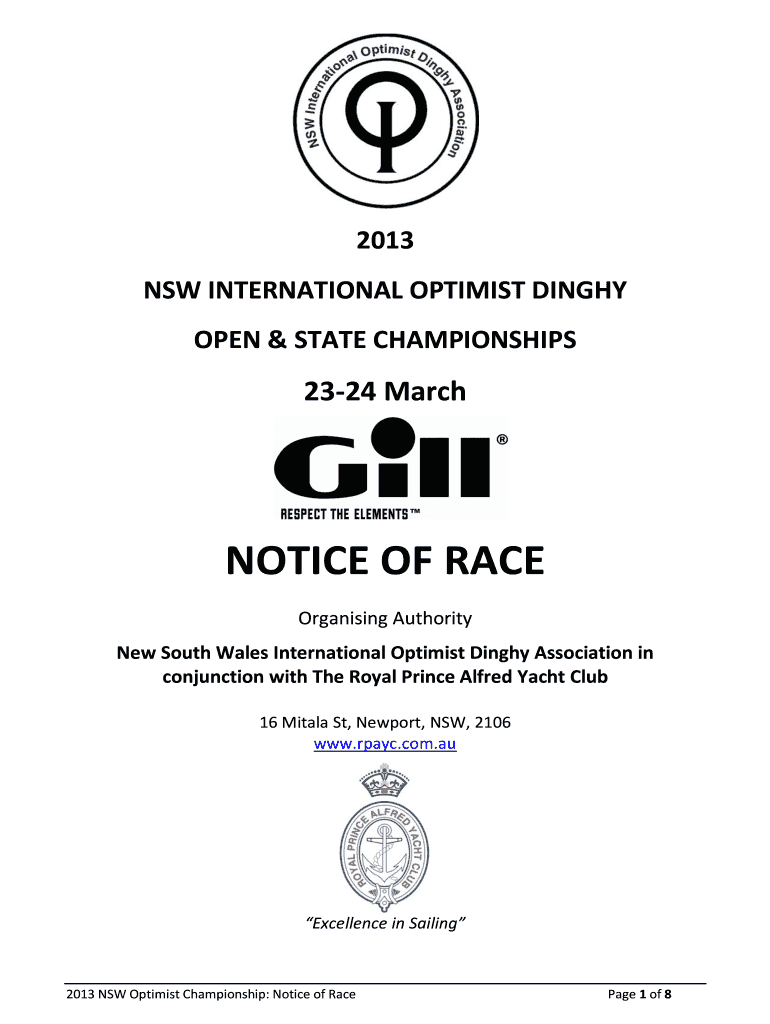 2013 NSW INTERNATIONAL OPTIMIST DINGHY OPEN & STATE CHAMPIONSHIPS 2324 March NOTICE OF RACE Organizing Authority New South Wales International Optimist Dinghy Association in conjunction with The Royal