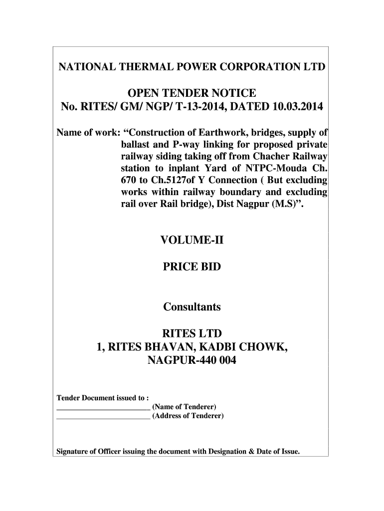 NATIONAL THERMAL POWER CORPORATION LTD OPEN TENDER NOTICE No. RITES/ GM/ NGC/ T132014, DATED 10.03.2014 Name of work: Construction of Earthwork, bridges, supply of ballast and Away linking for proposed