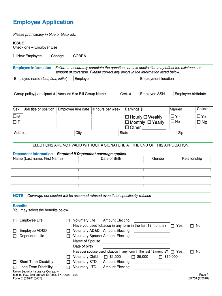 Employee Application Please print clearly in blue or black ink. ISSUE Check one Employer Use New Employee Change COBRA Employee Information Failure to accurately complete the questions on this application