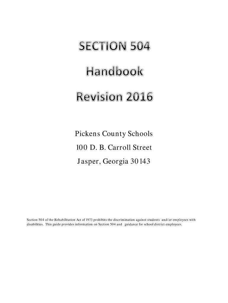 Pickens County Schools 100 D. B. Carroll Street Jasper, Georgia 30143 Section 504 of the Rehabilitation Act of 1973 prohibits the discrimination against students and/or employees with disabilities.