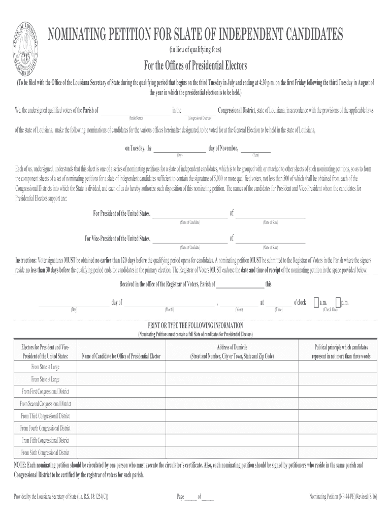 Provided by the Louisiana Secretary of State (La. R.S. 18:1254(C)) Page of Nominating Petition (NP-44-PE) Revised (8/16) NOMINATING PETITION FOR SLATE ...