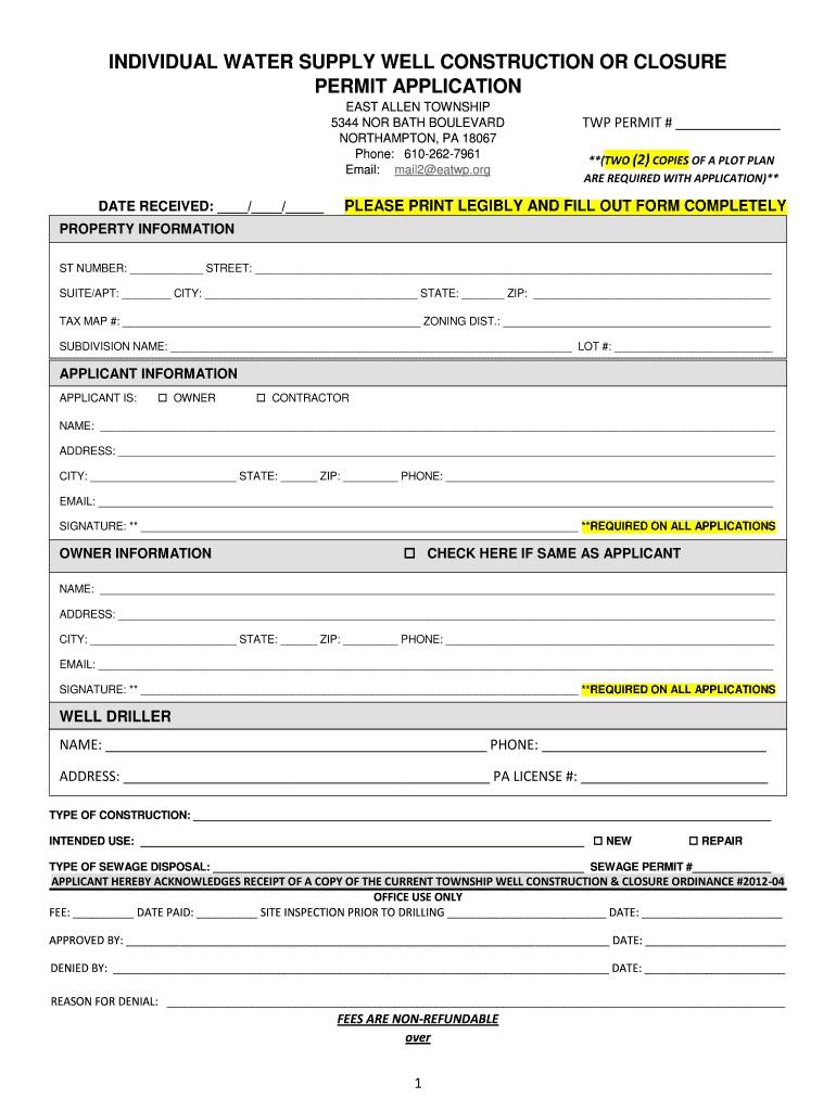 1 individual water supply well construction or closure permit application east Allen township 5344 nor bath boulevard Northampton, pa 18067 phones: 610-262-7961