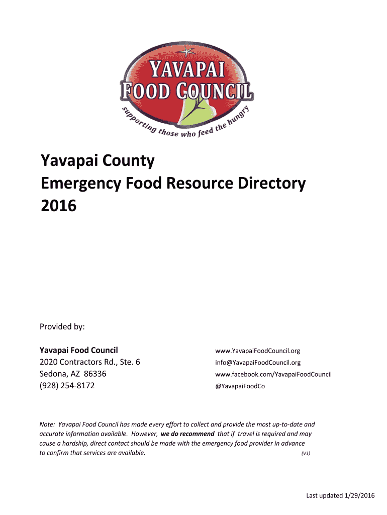 Yavapai County Emergency Food Resource Directory 2016 Provided by: Bavaria Food Council 2020 Contractors Rd., Ste. 6 Sedna, AZ 86336 (928) 2548172 www.YavapaiFoodCouncil.org info YavapaiFoodCouncil.org