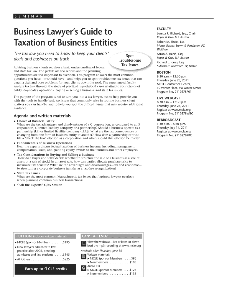 S E M I N A R FACULTY Business Lawyers Guide to Taxation of Business Entities The tax law you need to know to keep your clients deals and businesses on track Spot Troublesome Tax Issues Advising business