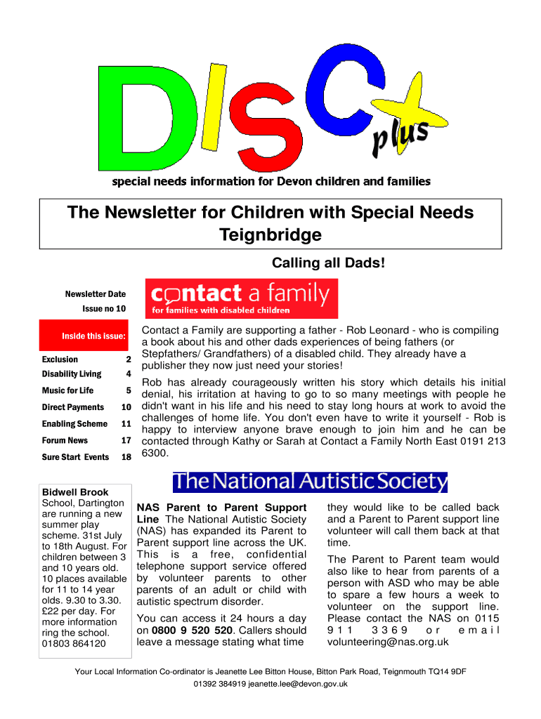 The Newsletter for Children with Special Needs Teignbridge Calling all Dads! Newsletter Date Issue no 10 Inside this issue: Exclusion Contact a Family are supporting a father Rob Leonard — who is