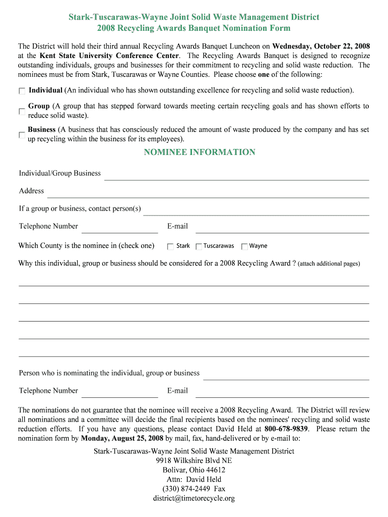 Stark-Tuscarawas-Wayne Joint Solid Waste Management District 2008 Recycling Awards Banquet Nomination Form The District will hold their third annual Recycling Awards ...