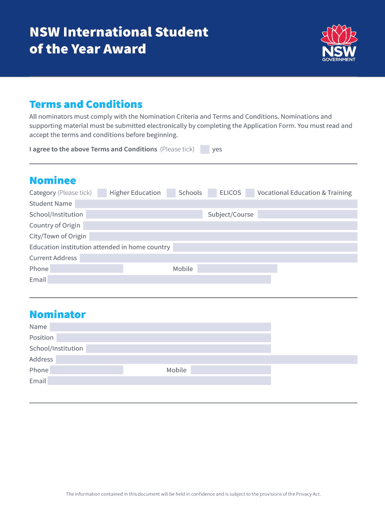 NSW International Student of the Year Award Terms and Conditions All nominators must comply with the Nomination Criteria and Terms and Conditions.