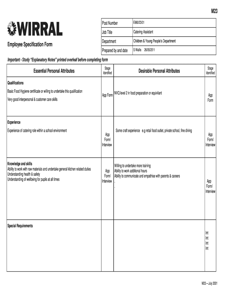 M23 Post Number Job Title Catering Assistant Department Children & Young People s Department Prepared by and date Employee Specification Form E960/23/01 S Wallis 26/05/2011 Important Study Explanatory