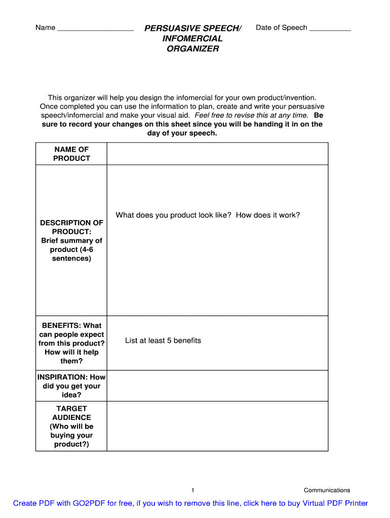 Get the free Name PERSUASIVE SPEECH/ Date of Speech INFOMERCIAL ORGANIZER