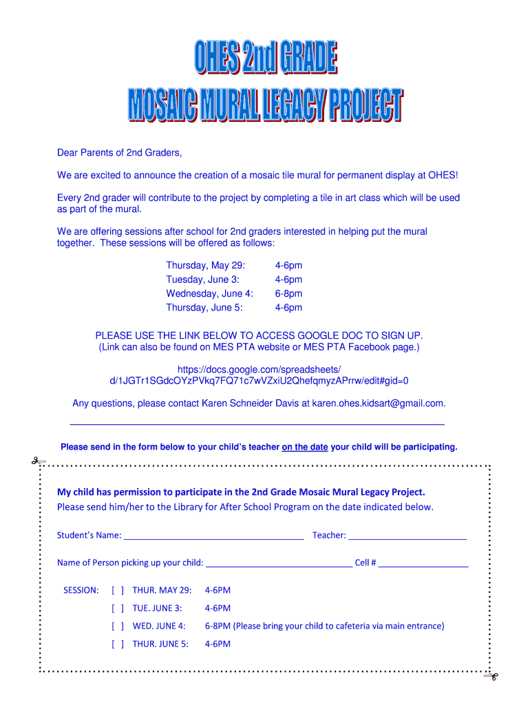Dear Parents of 2nd Graders, We are excited to announce the creation of a mosaic tile mural for permanent display at ONES! Every 2nd grader will contribute to the project by completing a tile in art